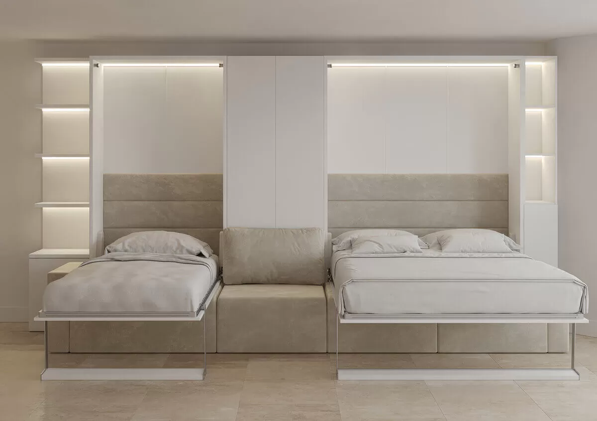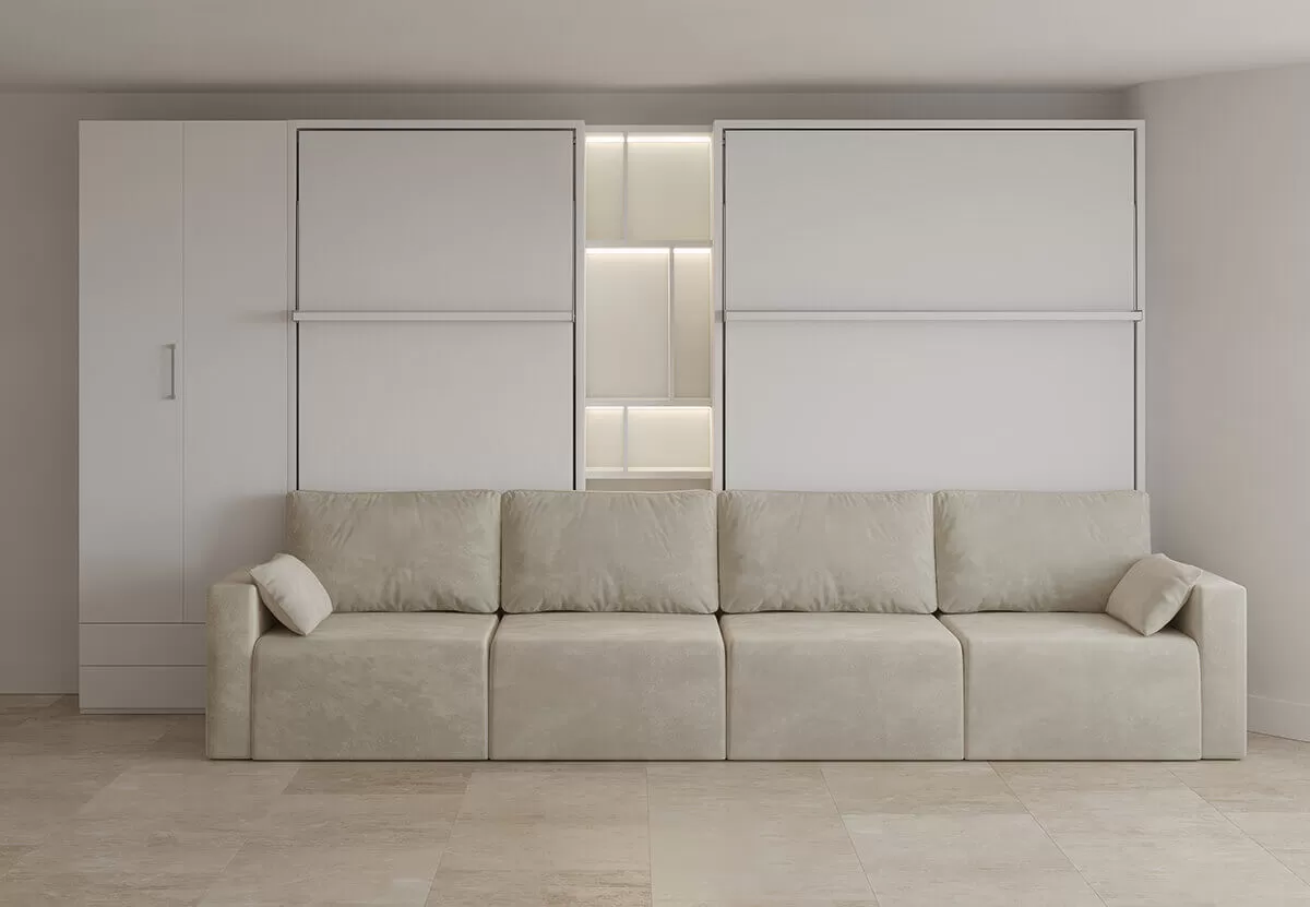 Royal Queen and Twin Wall Bed with Sectional Sofa Bookcase and Wardrobe