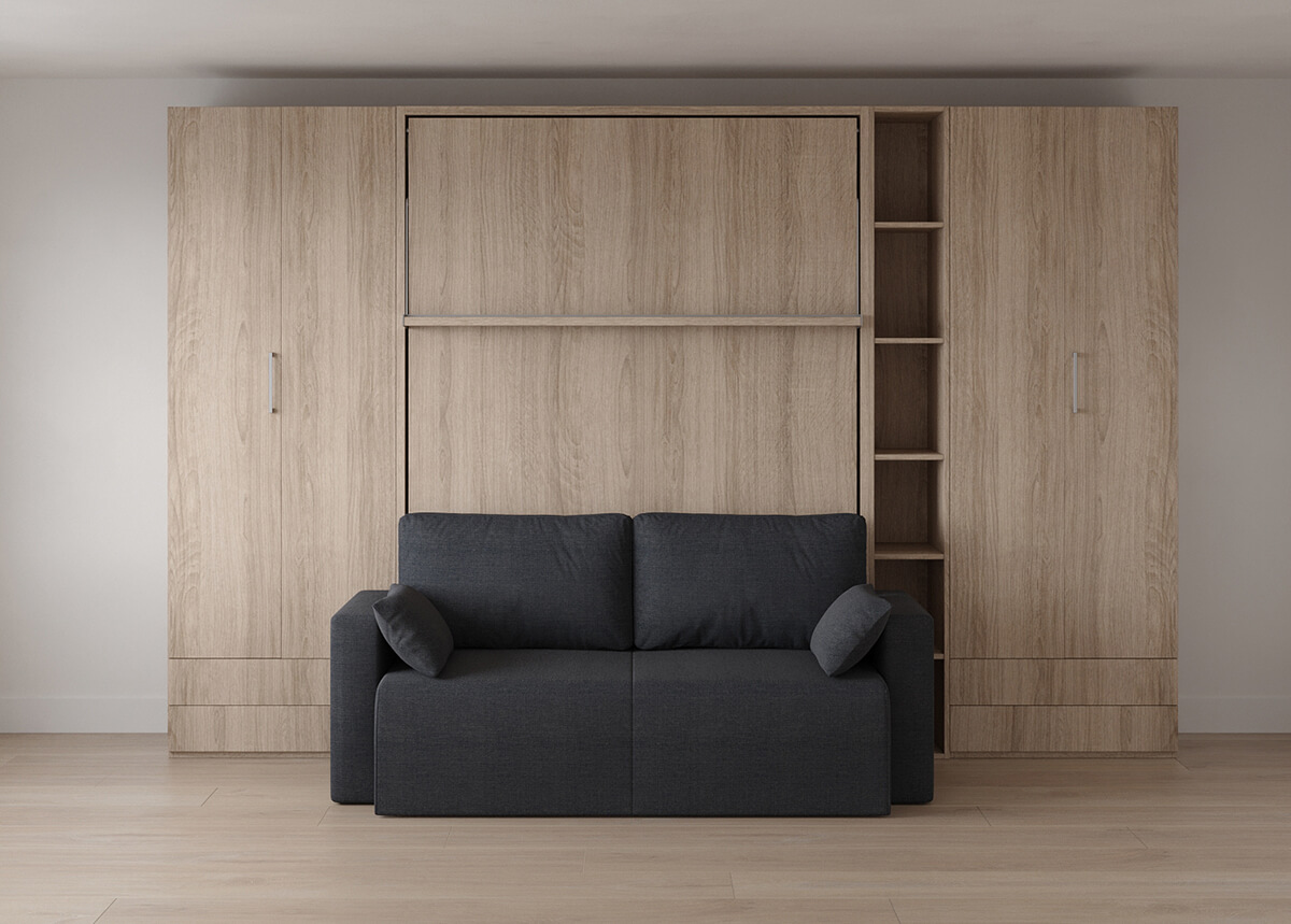 ROYAL Queen Wall Bed with Sectional Sofa and Bookcase