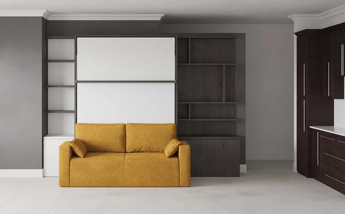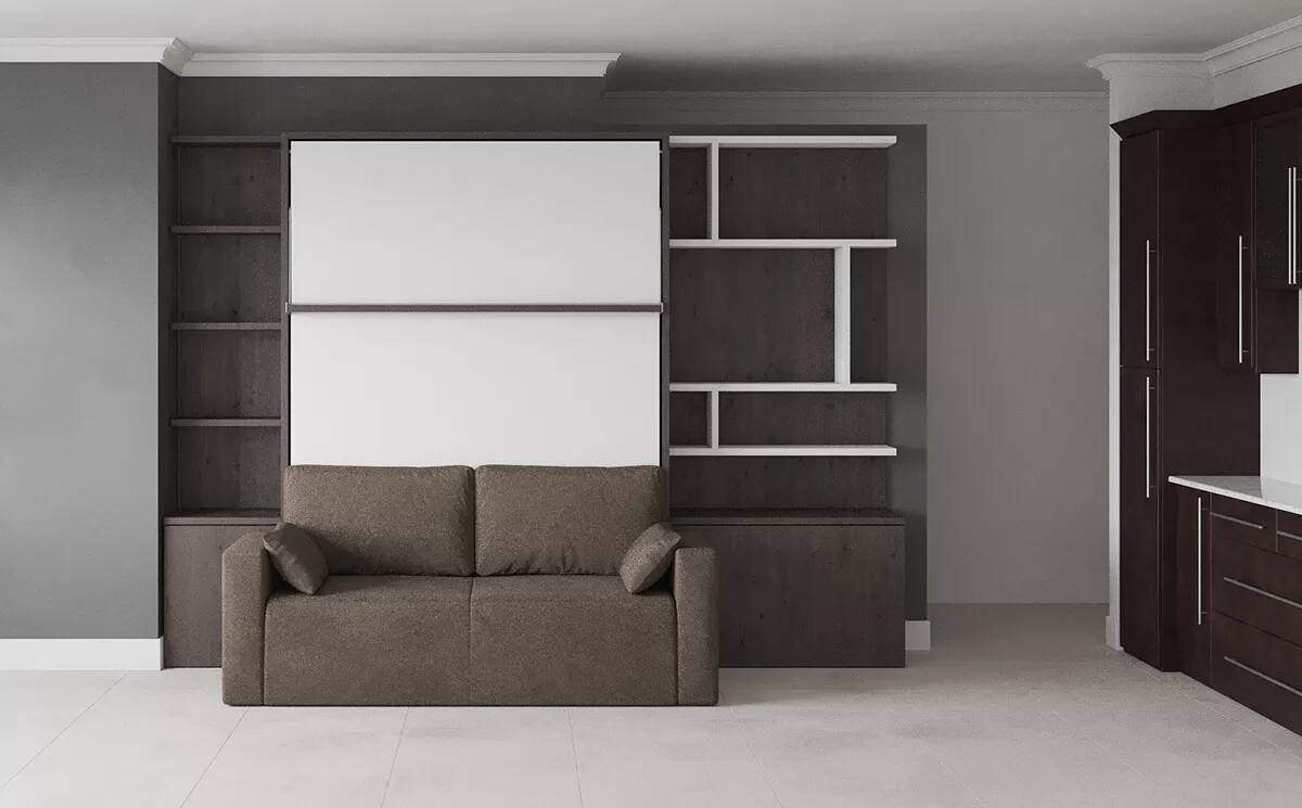 ROYAL Queen Wall Bed with Sectional Sofa and Bookcase
