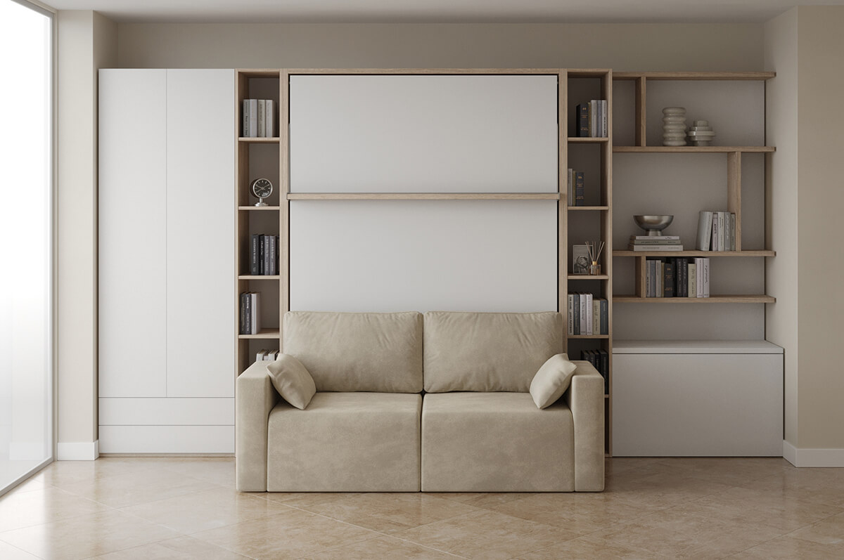 ROYAL Queen Wall Bed with Sectional Sofa and Bookcase Set