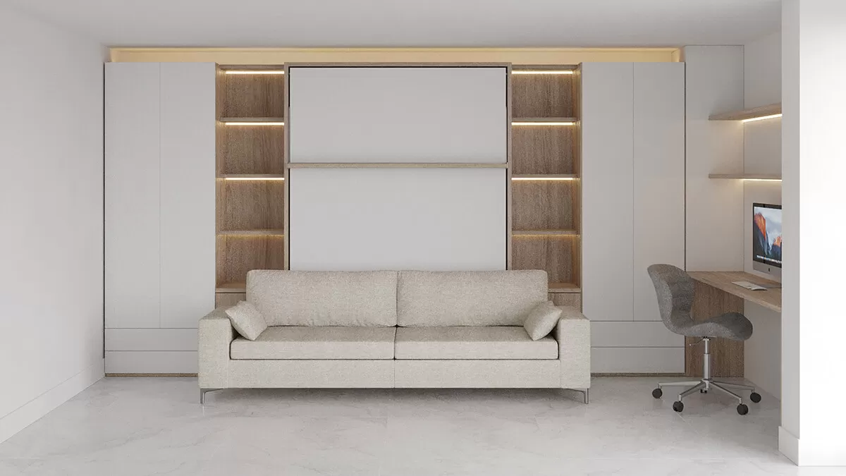 ROYAL Queen Wall Bed with Sectional Sofa Bookcase and Wardrobe