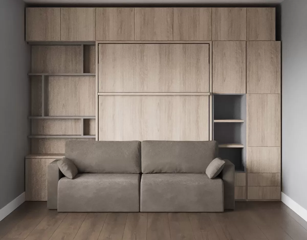 Royal Queen Wall Bed with Sectional Sofa, Wardrobes and Bookcase