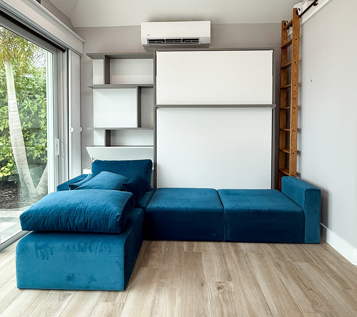 ROYAL Queen Wall Bed with Sectional Sofa and Bookcase